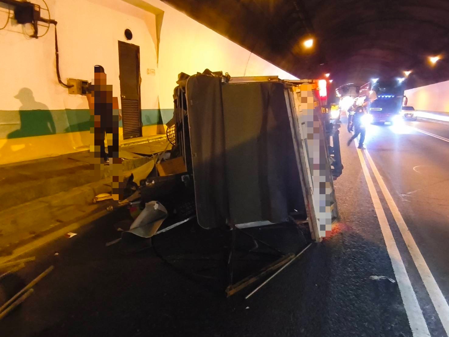國道3號新店隧道內貨車急切翻覆! 青菜掉滿地