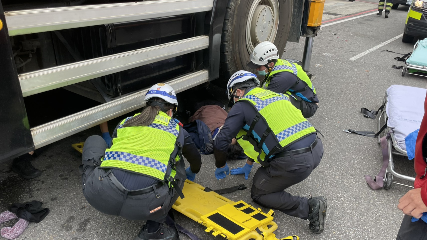 消防隊員救援受困吊車底下的行人。翻攝畫面