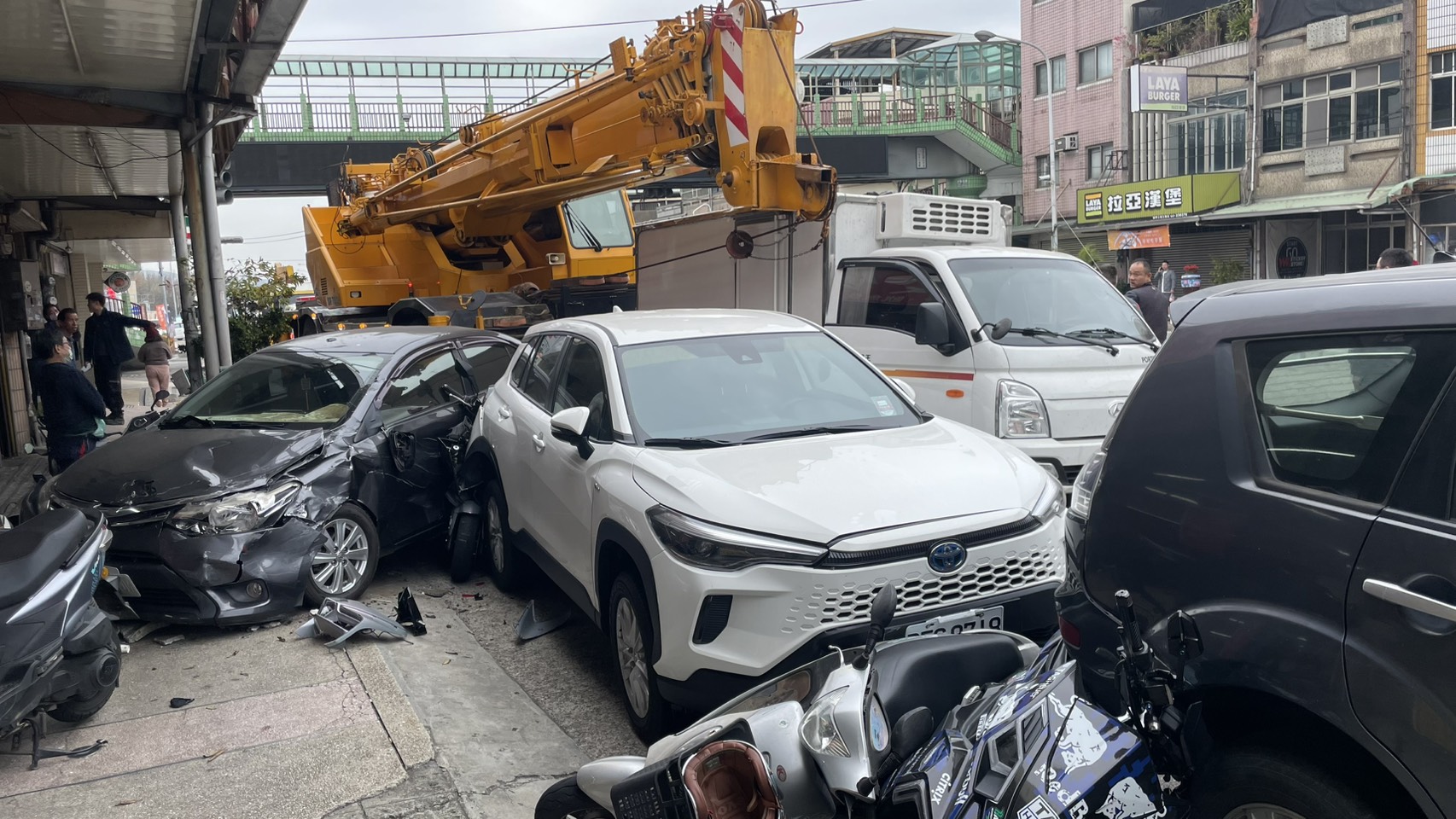 苗栗吊車失控撞11輛車及1名行人,並造成行人受困吊車底下,由消防隊員救出送醫。翻攝畫面