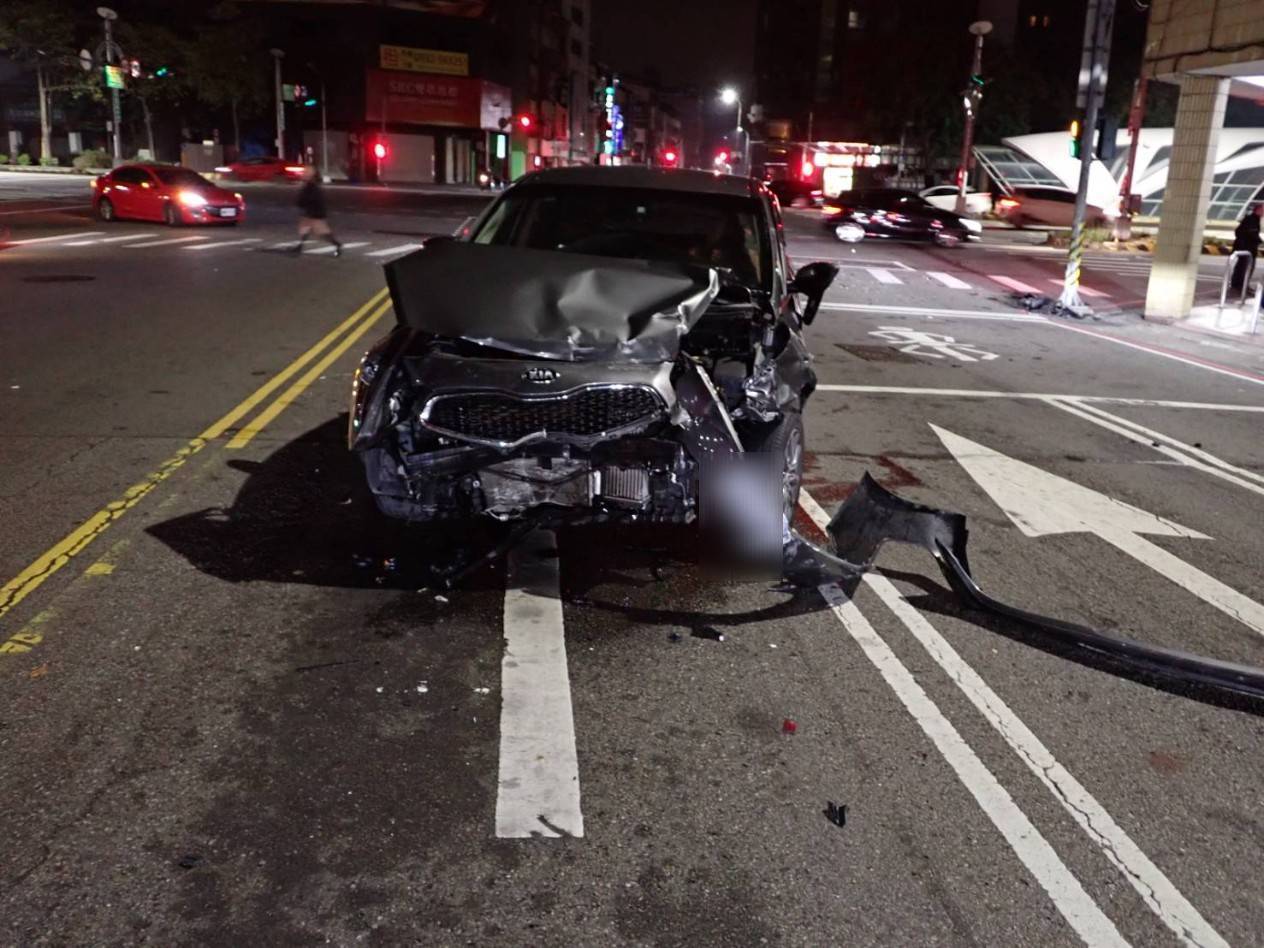 肇事轎車車頭嚴重毀損。翻攝畫面