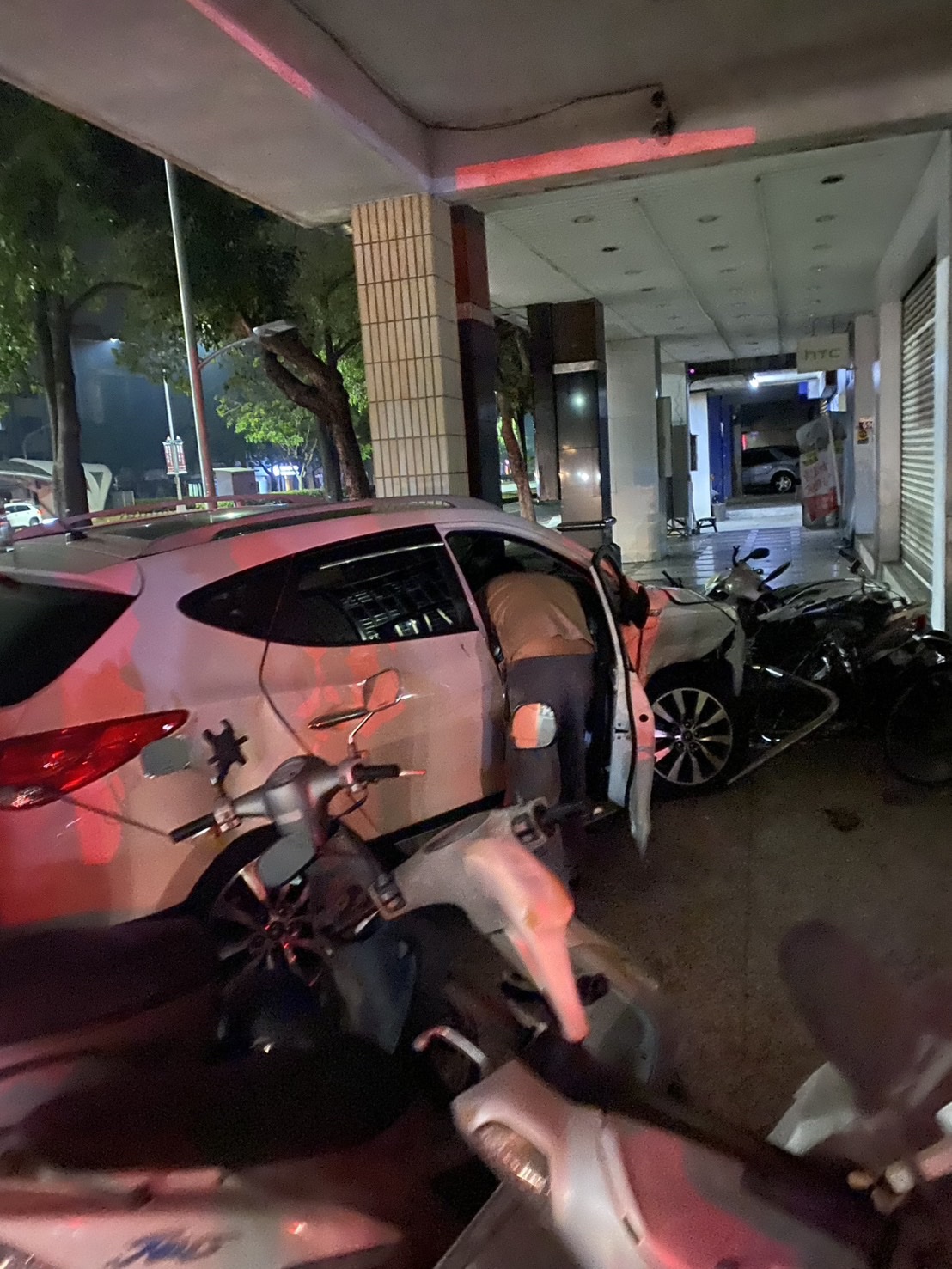 轎車衝進騎樓撞擊機車及腳踏車。翻攝畫面