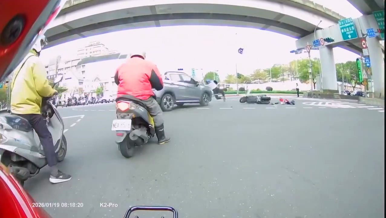 網友在Threads發文指出,19日早上8點多,在南京東路六段跟新明路298巷路口看到車禍。影片中眾騎士起步後,突然一輛休旅車衝出將騎士撞飛,騎士當場倒地不起,旁邊原在指揮交通的警員也立刻上前處理。