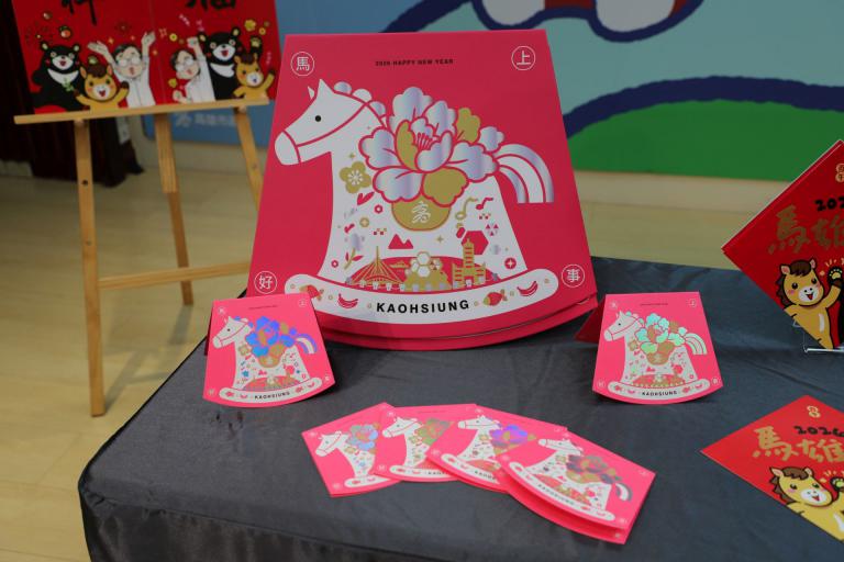 傳統春聯由書法家蔡典成題字,《躍馬迎福》強調攜手躍進的新春氣象;《駿騰迎祥》象徵突破進取的動能與城市躍升願景;《馬雄好》斗方春聯以馬年生肖搭配在地元素,融入吉祥物「高雄熊」,巧妙展現一語雙關「馬上好」的寓意;新春賀卡由青年設計師林士揚操刀,結合童真歡樂的木馬、富貴圓滿的牡丹及高雄著名地標,共同迎向「馬上成真」的美好願景。