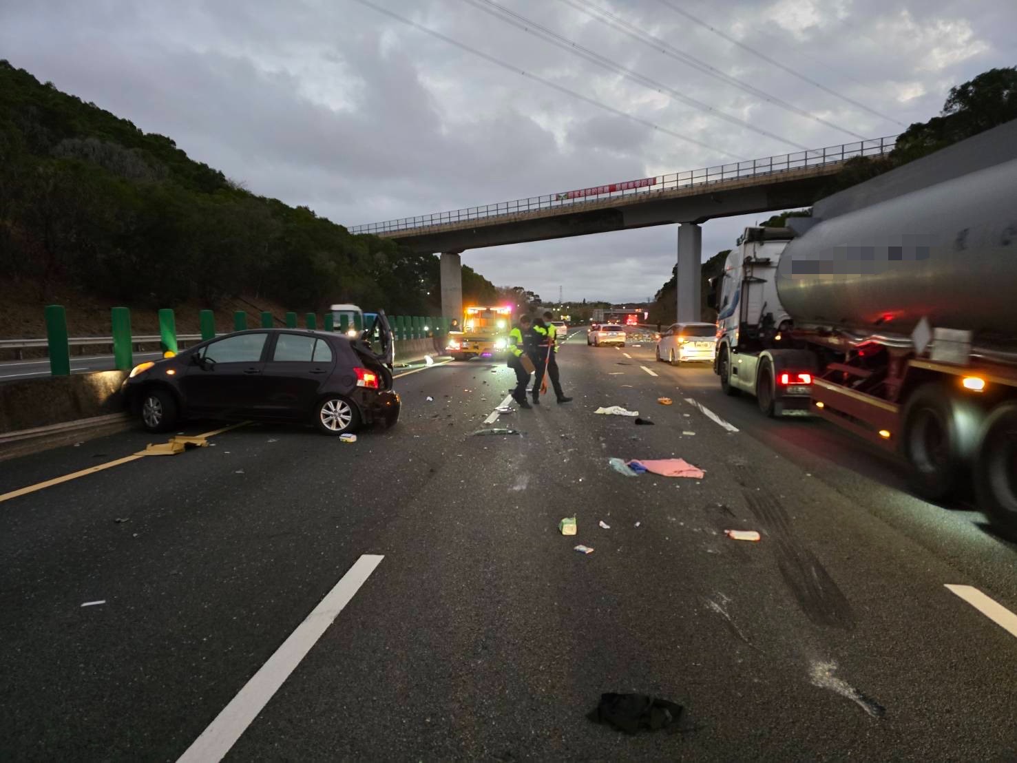 【Lai傳媒、記者爆料網/周庭慶/台中報導】今(21)日清晨6點多,國道3號北上166.3K靠近大甲交流道路段發生聯結車與小客車事故,佔用外側及中側車道,貨物散落一地,車流回堵至中港系統,目前國道警方和高公局人員還在現場處理中,初步了解是兩車相撞無人受傷。