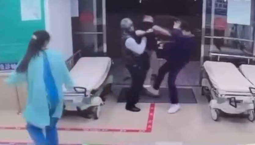 台中澄清醫院中港院區發生急診暴力事件,1名急診室男員工從櫃台飛身出去欲制止動手打人的嫌犯。翻攝杜承哲醫師臉書