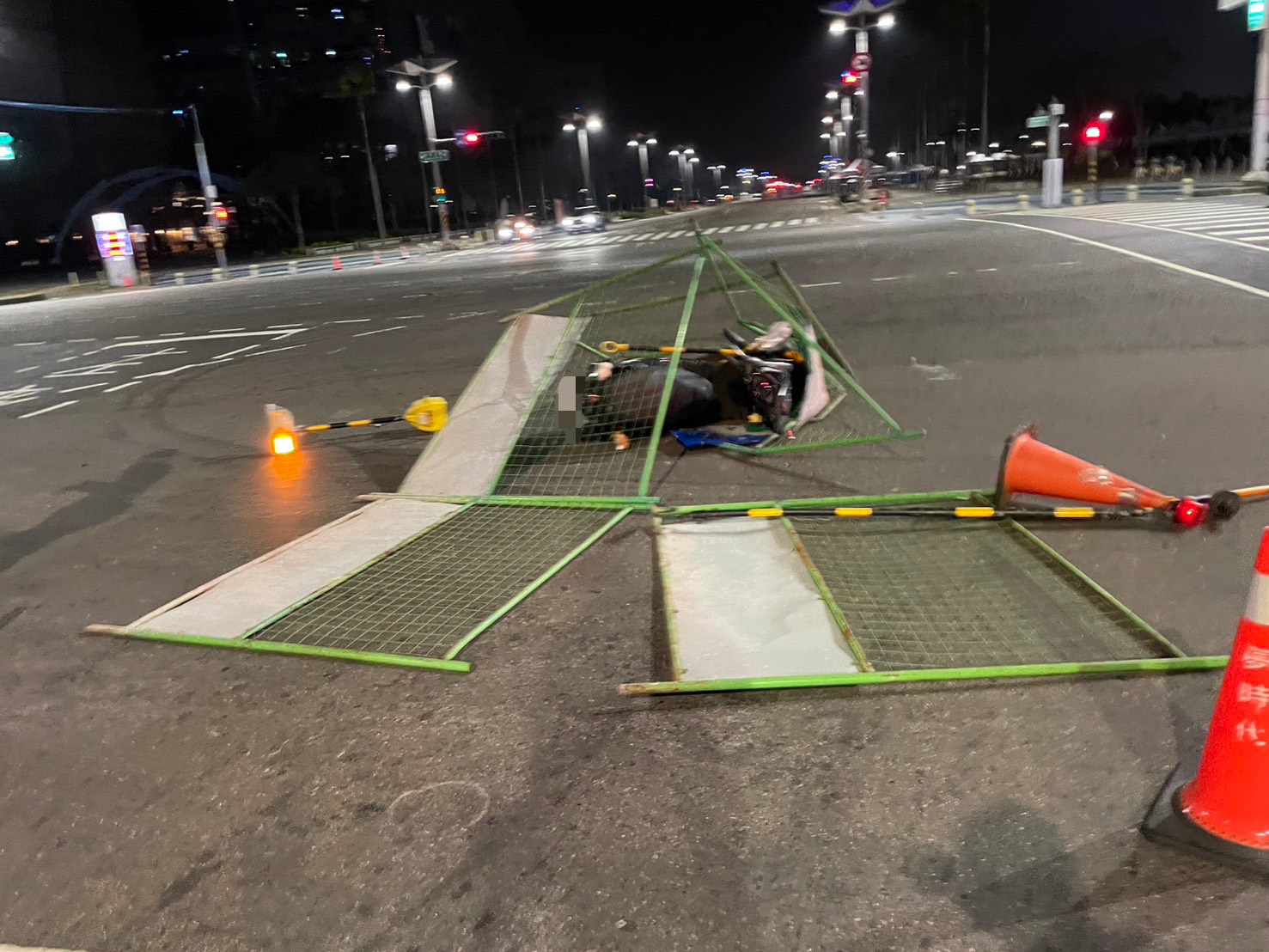 高雄前鎮中華五路今(24)日傳出一起交通事故,一名機車騎士在凌晨1時許,行經夢時代前,疑似未注意車前狀況,直接撞上施工護欄,當場人車倒地。