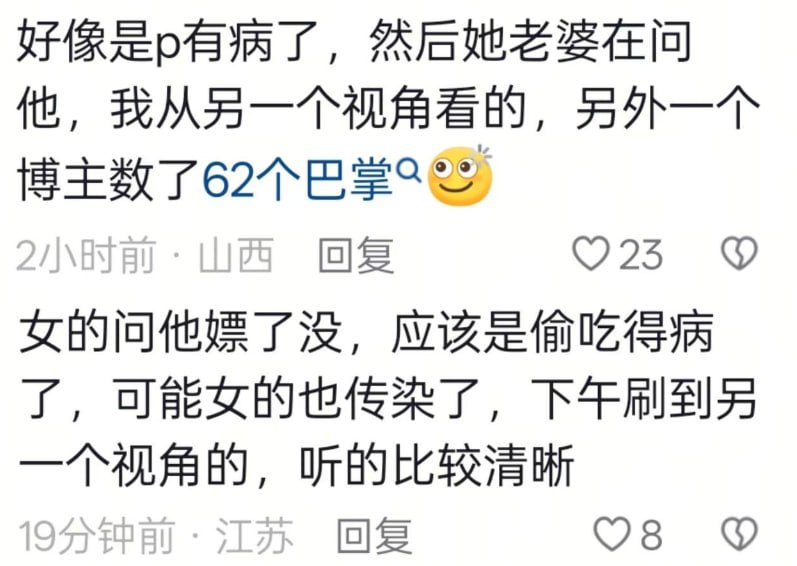 中國有網友分享影片,指出在江蘇醫院看到有一名女子打男子62巴掌,有網友指出有另一視角的影片,對雙方的對話聽得比較清楚,主要是老婆問老公是不是去嫖,應該是出去偷吃得性病,可能女方也被傳染。