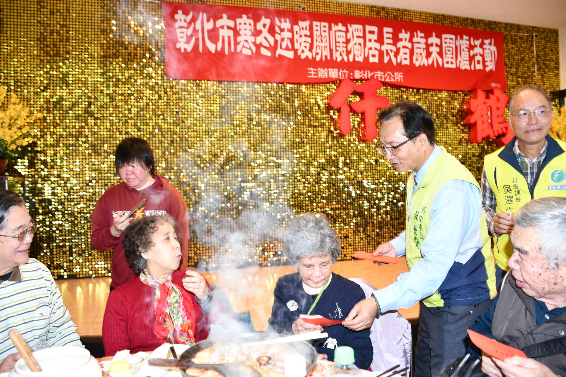 彰化市公30日舉辦「寒冬送暖關懷獨居長者餐會」活動,會中先安排鎧林美學美髮師傅為長者義剪頭髮,之後再神清氣爽地舒服用餐,餐會中並致贈64位長者每人500元春節禮金,市長林世賢同時提醒獨居長者們天冷要多添增衣褲,並提早預祝大家春節快樂。