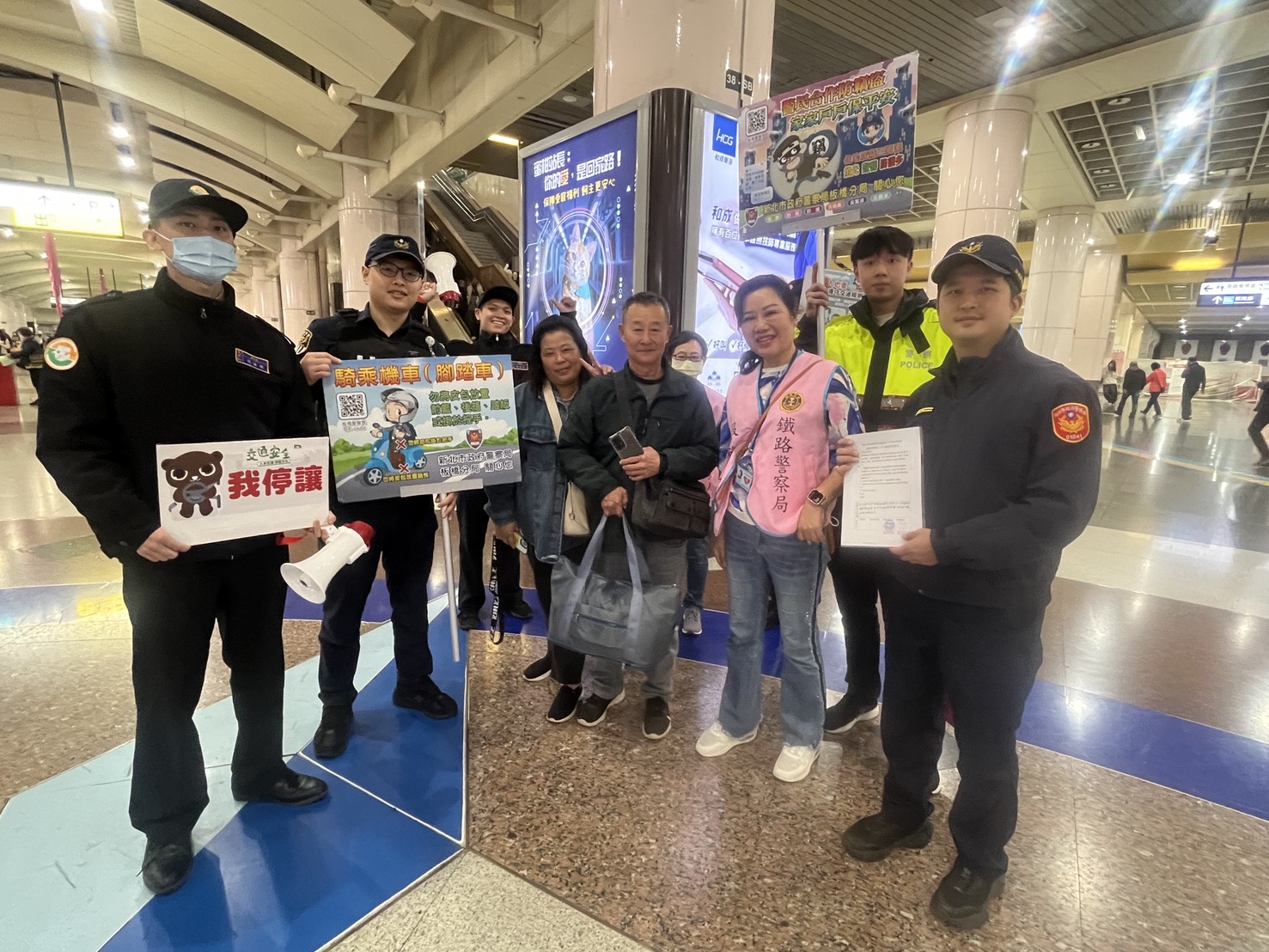 板橋分局員警在車站等人潮密集場所宣導交通及治安維護。翻攝畫面