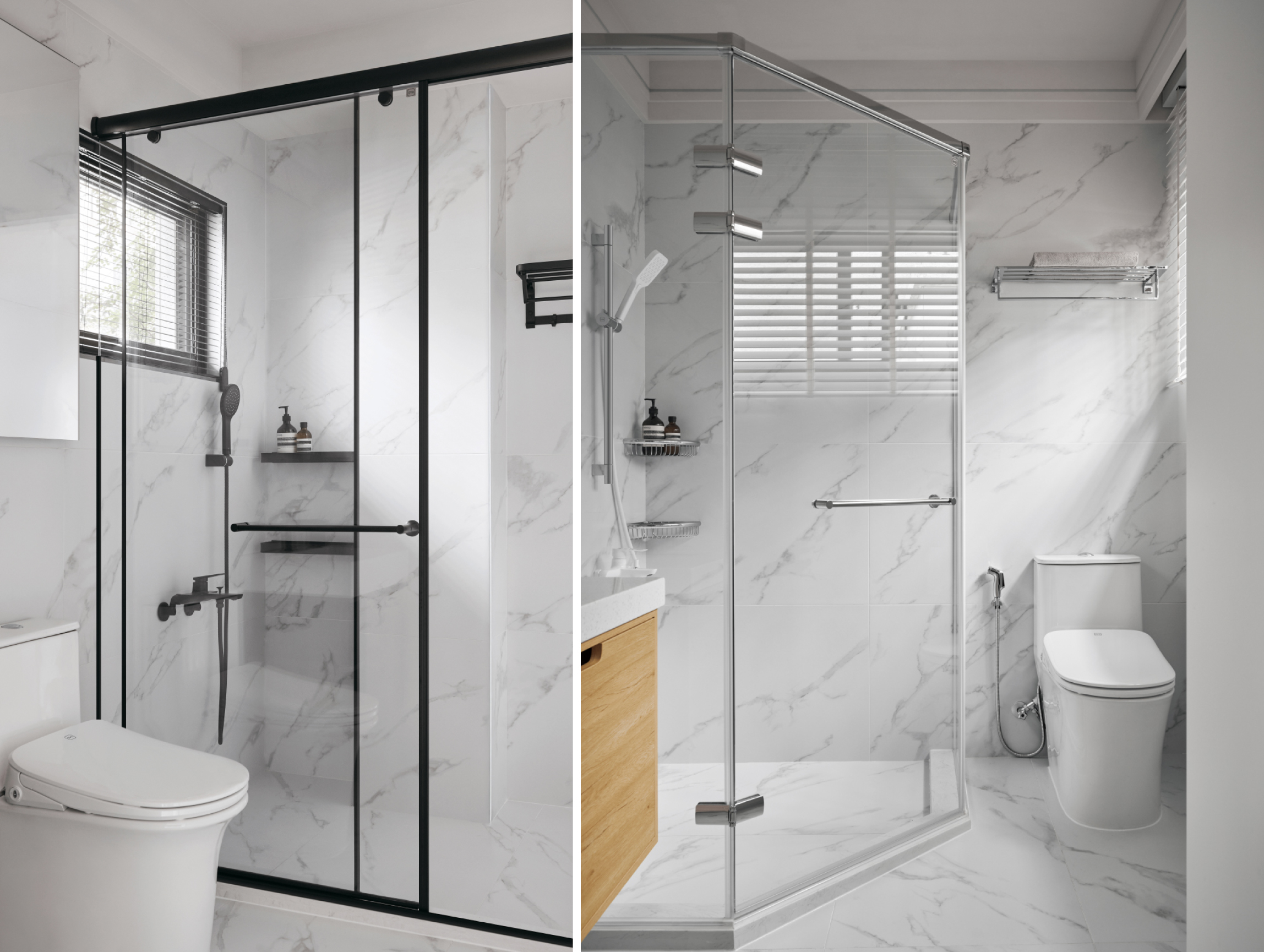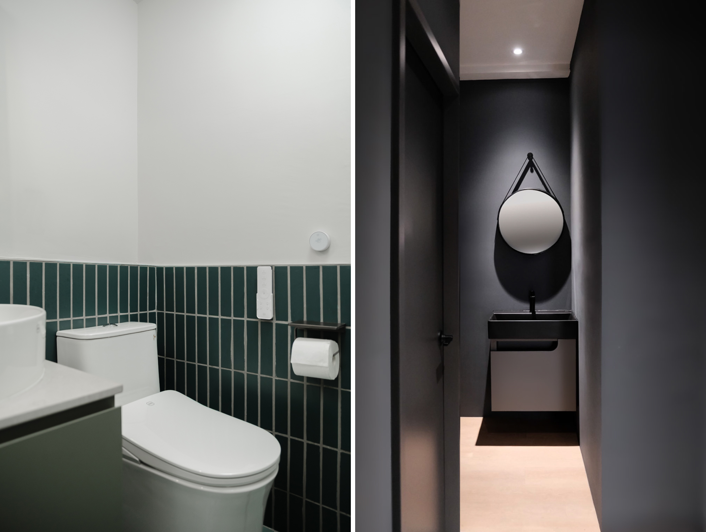 同時,針對家中不同成員的需求與喜好,亦使品牌豐富的色系優勢有所展現。在兩間標準格局的小孩房衛浴,分別運用「爵士黑」與「鋼琴白」系列單品,細膩打造出截然不同的空間氛圍。而大空間的客衛則透過客製化服務,量身打造出兼具大氣與收納機能的櫃體、檯面,讓每位客人走進就能感受到屋主的品味與細心,滿版尺寸的訂製品也讓主人家在日常清潔維護上更省心。客製化服務發揮品牌高度適配的優勢,滿足現代人對衛浴的美學期待。