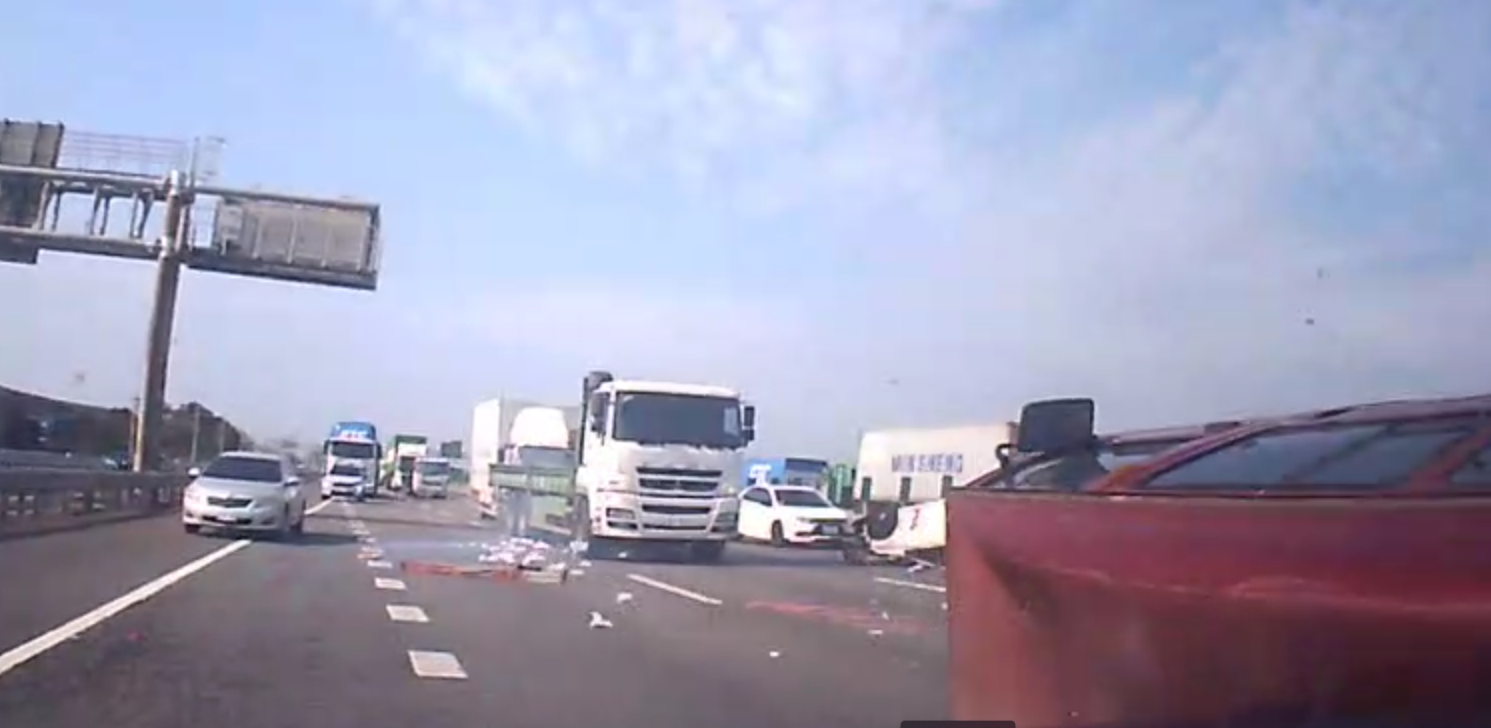 國道1號中壢路段連環車禍,其中小貨車與自小車相撞後翻覆。翻攝畫面
