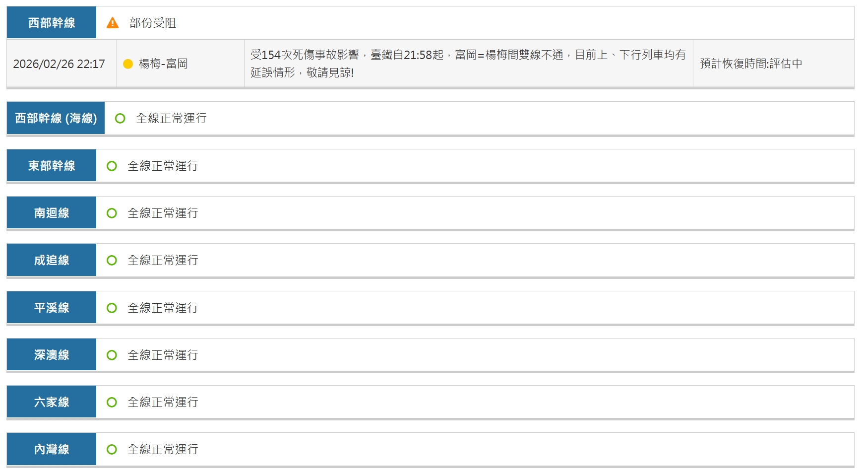 【賴傳媒、記者爆料網 王俊勝/桃園報導】桃園市今(26)日晚間發生台鐵人身事故,西部幹線富岡至楊梅間有行人疑似闖入軌道,遭北上154次自強號撞擊不治,現場一度封鎖處理,南北向列車班次也受到影響出現延誤。