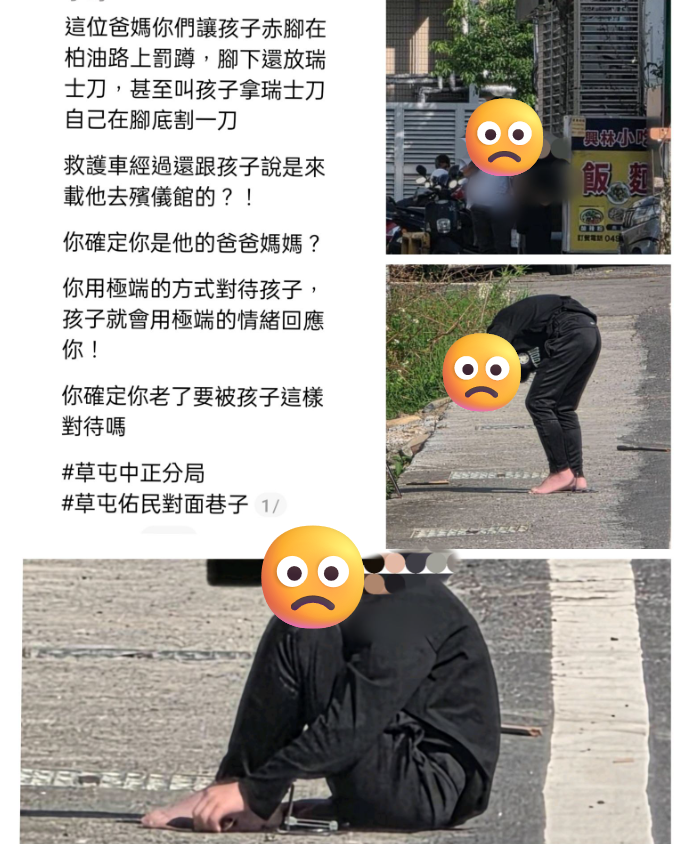 南投當地臉書社團上有民眾分享照片並發文痛斥,家長不只讓孩子赤腳在柏油路罰蹲,腳下還放了刀,甚至開口叫孩子拿刀自己在腳底割一刀。更令人不寒而慄的是,當救護車經過時,家長竟對孩子說那是來載他去殯儀館的,用這種話恐嚇一個9歲的孩子,看到的人無不心驚。