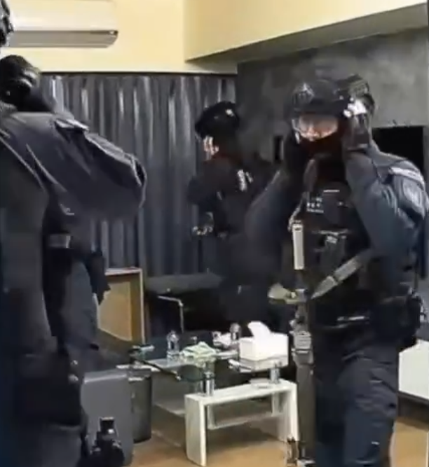 台中維安特勤帶隊攻堅逮捕持有槍毒的通緝犯,使用震憾彈之前員警迅速捂住耳朵。翻攝畫面