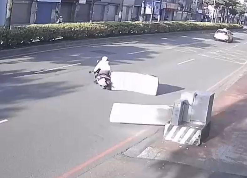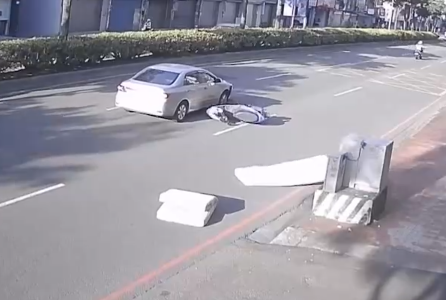 機車騎士被床墊砸中倒地,差點被路過的車子輾過。翻攝畫面