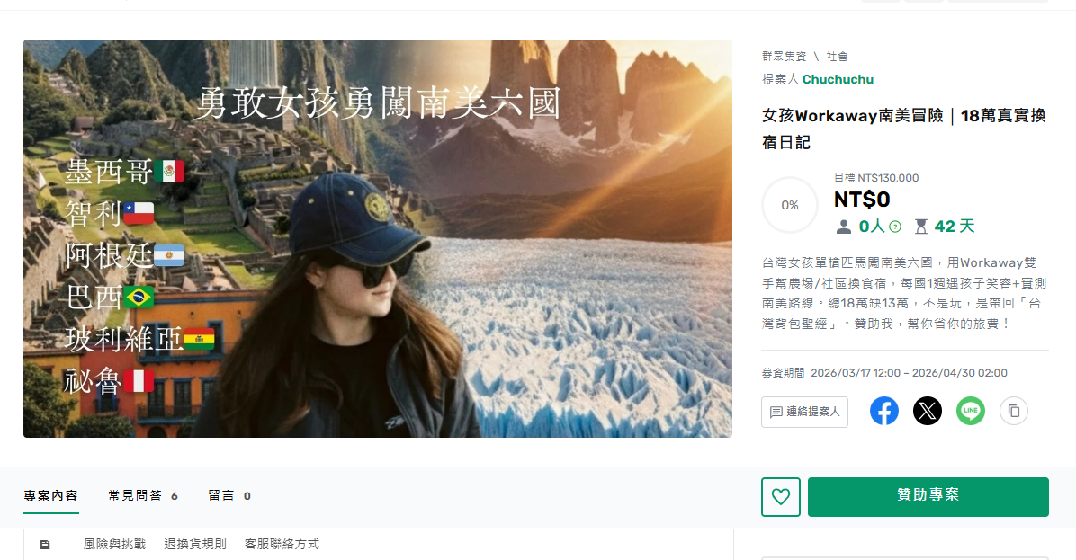 一名台灣女子要去南美六國,總18萬缺13萬,於是開募資稱,稱不是玩是帶回台灣背包聖經,「贊助我,幫你省你的旅費!」