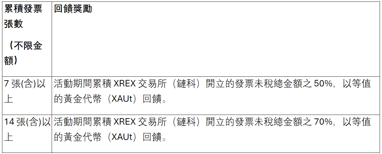 - 活動獎勵:活動期間內,用戶凡累積達指定次數之手續費發票,即可獲贈等值黃金代幣(XAUt)之交易手續費回饋。
