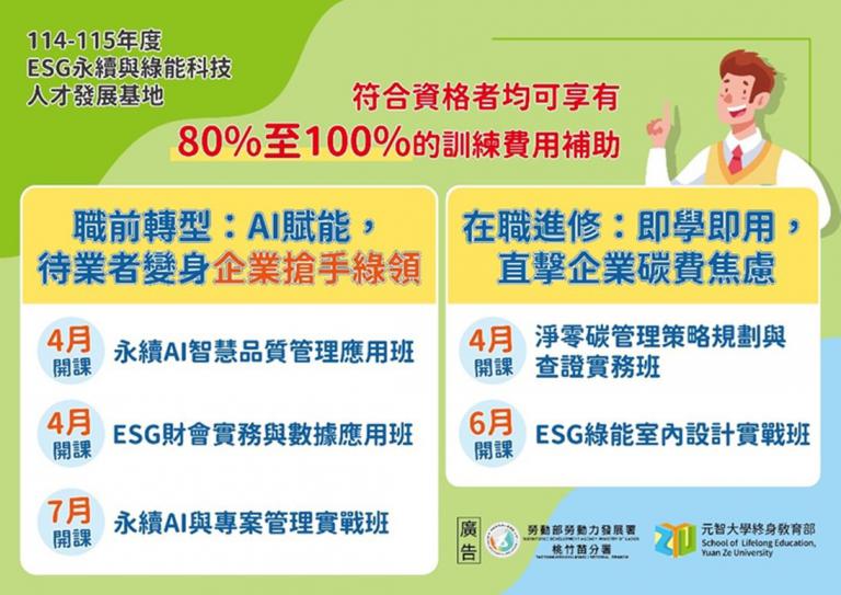 ▲桃竹苗分署與元智大學合作開課,培訓ESG科技人才,即日起報名。(圖╱桃竹苗分署提供)