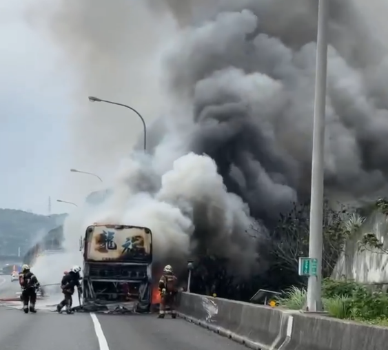 國道1號遊覽車失火濃煙沖天火勢猛烈。