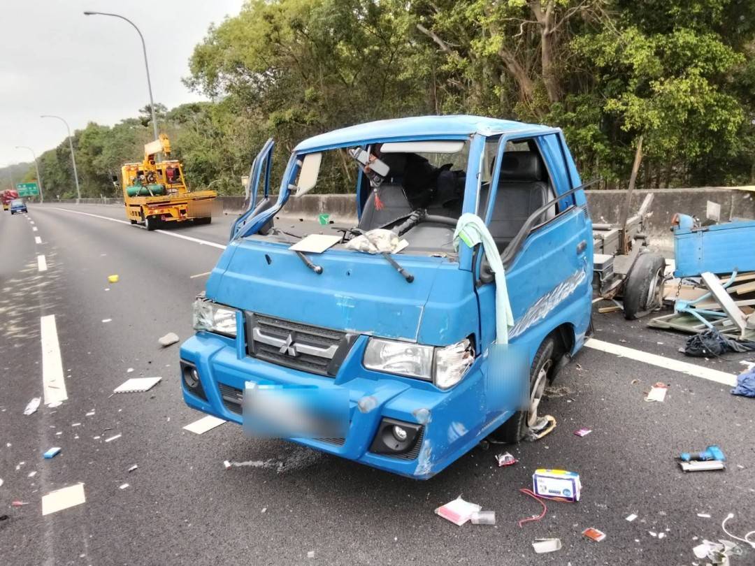 國道1號小貨車撞護欄車斗噴出並造成兩人受傷。翻攝畫面