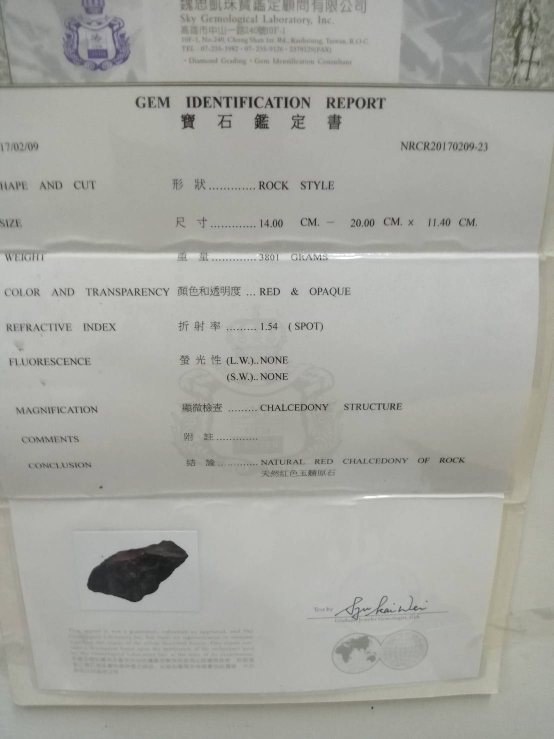 天然紅色玉髓原石鑑定書 (圖/店家提供)