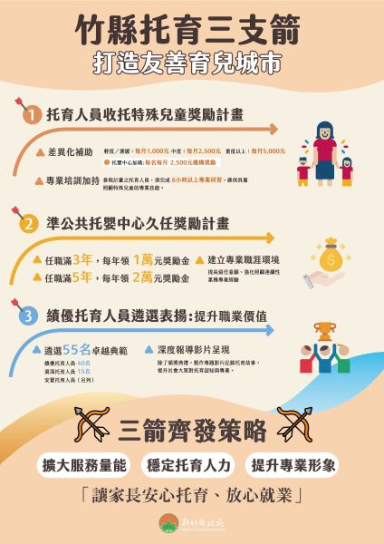 新竹縣長楊文科於兒童節前夕,宣布三項托育支持政策,透過制度獎勵與專業培訓雙軌並行,全面提升托育服務量能與品質,「托育人員收托特殊兒童獎勵計畫」依照障別等級托育人員每名每月最高補助5000元,今年將舉辦「績優托育人員遴選表揚活動」,並配合已實施的「準公共托嬰中心托育人員久任獎勵計畫」,盼三箭齊發打造更友善的托育環境。