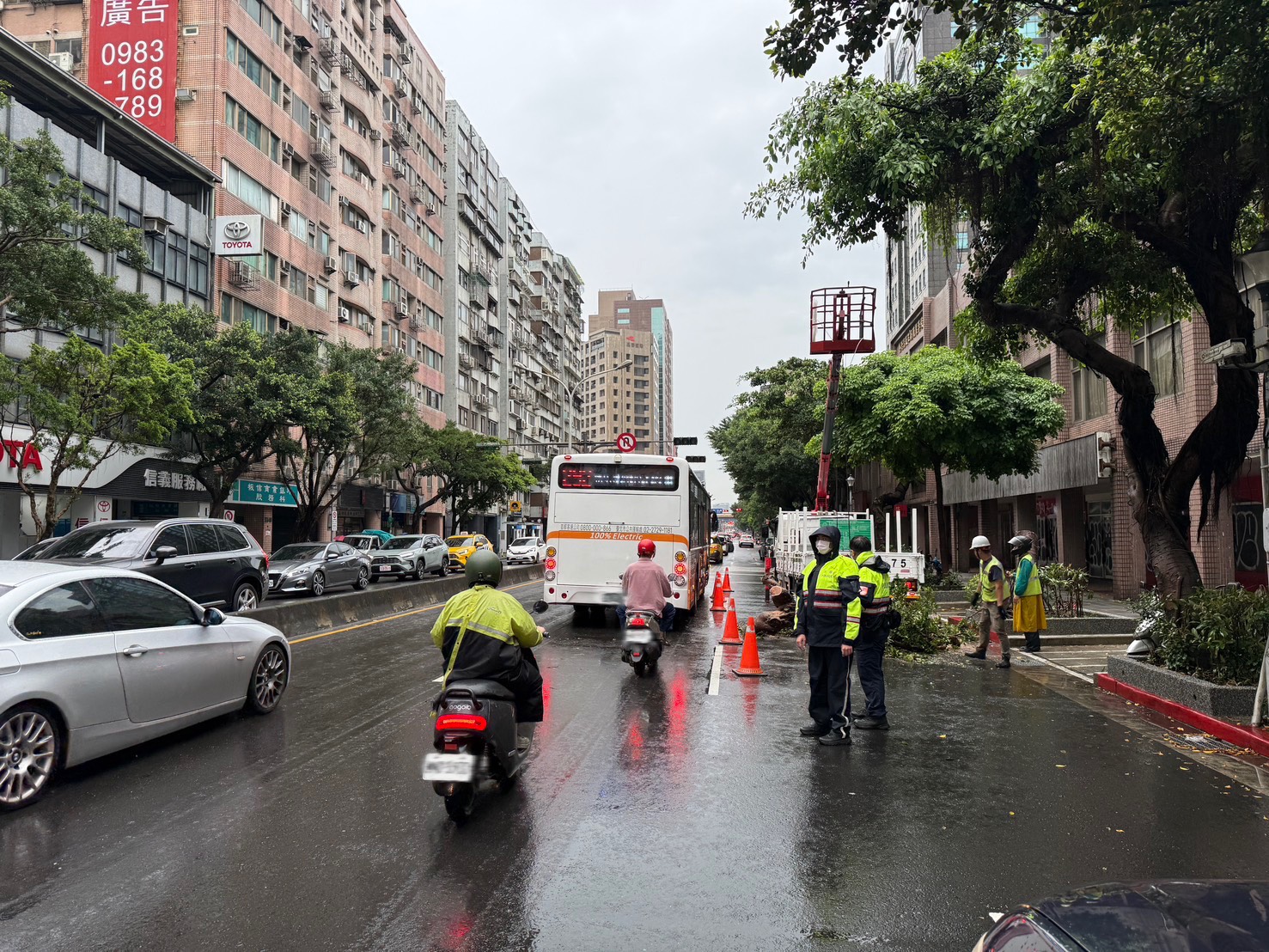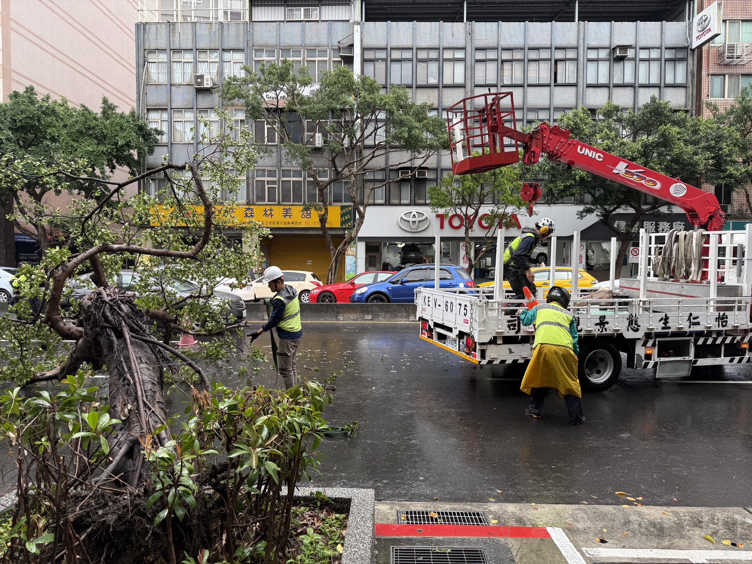 台北市基隆路路樹倒塌害兩車追撞(紅框處)。翻攝畫面