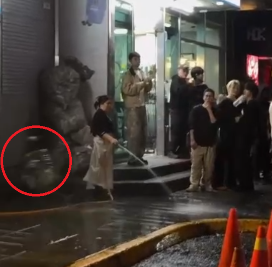 清潔工作婦人朝群眾潑水引發不滿,被砸裝空酒瓶的回收籃(紅圈處)。翻攝畫面