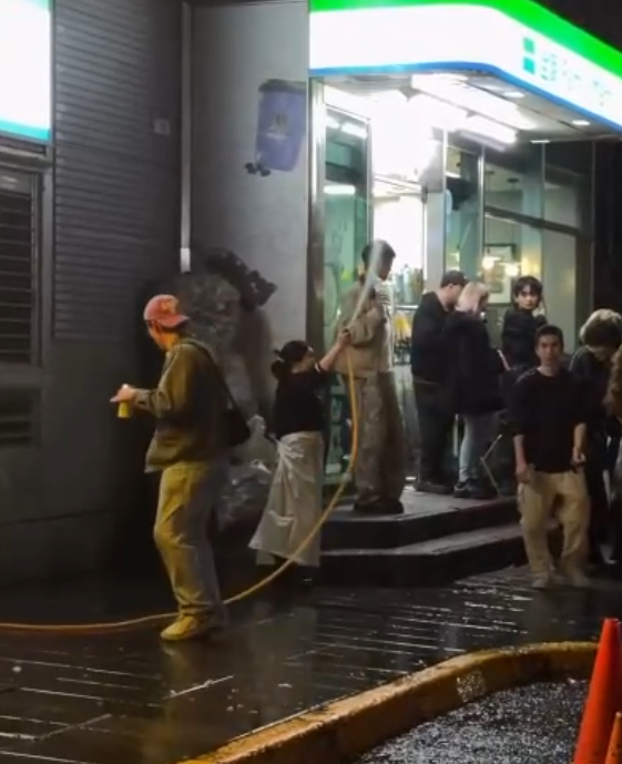 清潔工作婦人朝天空灑水灑到民眾引起不滿。翻攝畫面