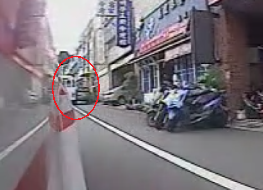 苗栗縣消防局救護隊員直擊中型巴士撞擊停路邊廂型車逃逸(紅圈處),一路尾隨並將駕駛攔下報警處理。翻攝畫面