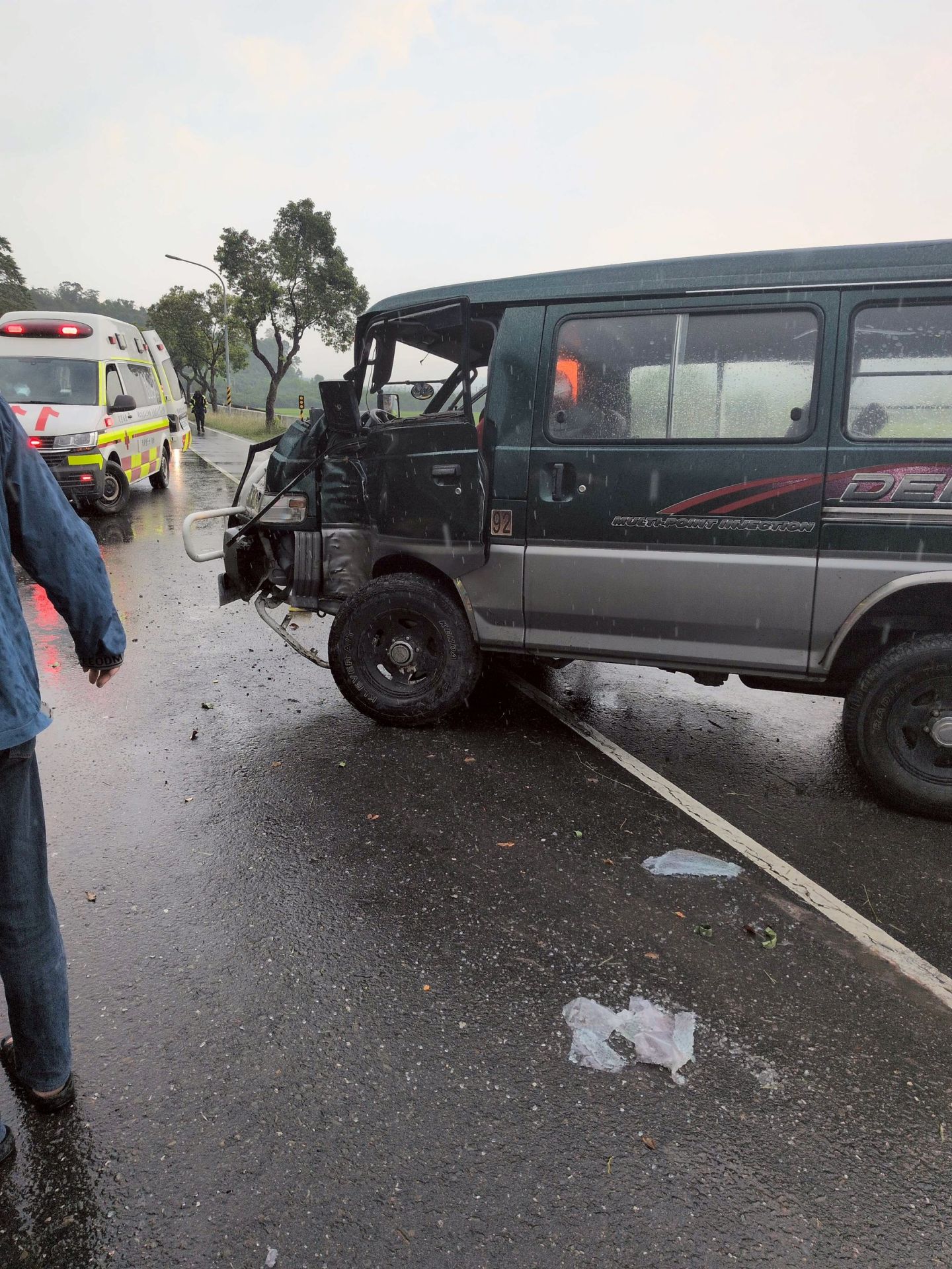 【Lai傳媒、記者爆料網/周庭慶/台東報導】台東縣鹿野鄉中華路今(6)日清晨發生一起嚴重自撞車禍!一輛休旅車疑因天雨路滑失控自撞,強大的撞擊力道不僅讓車頭嚴重變形,車內乘客拋飛車外橫躺雨中;駕駛則夾在擠壓變形的駕駛座內。台東縣消防局迅速派遣鹿野、延平分隊到場展開一場與死神拔河的搶命大戰,救出受困駕駛拋飛車外乘客一併送醫。