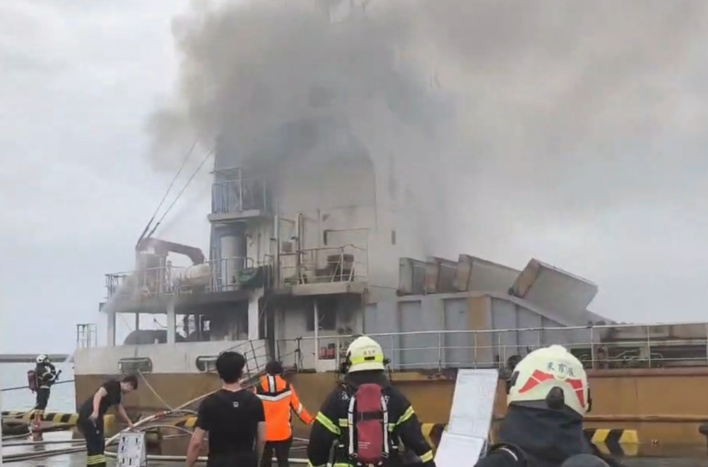 起火貨船冒出濃煙消防隊員前往灌救。翻攝畫面