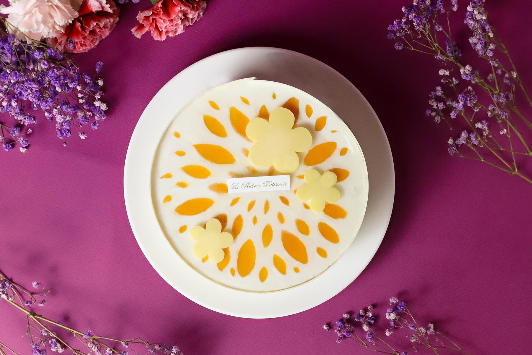 蛋糕內層以柚子與蘋果交織出帶有透明感的果凍層,搭配乳酪慕斯與千層堆疊,酸甜之間保有清晰輪廓;外層則覆上帶有淡雅花香的洋甘菊香緹,輕柔地收住整體風味 ; 頂部白巧克力片以花卉圖騰與母親節字樣呈現,視覺上,如同收到一份雅緻的祝福。「夏天的水果風味本來就比較明亮,我們希望把這種活潑的感覺放進蛋糕裡。」李主廚提到,柑橘與蘋果的酸度並非為了創造對比,而是讓整體風味更有呼吸感,讓人可以不知不覺,一口接一口停不下來。