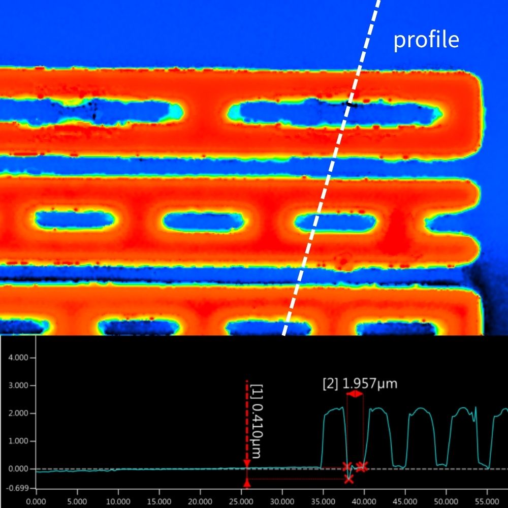 面對先進封裝與高階載板挑戰,A-TECH 與科技法人研究院合作,針對規格達 2/2μm 極細線路樣品進行反覆實驗驗證。STD+ 展現了卓越的細微缺陷加工能力,同時對基本的傷害控制在極微小範圍。修補後的樣品經由雷射共軛焦顯微鏡的 3D 高解析驗證,對於基板底材的損傷與熱影響皆獲得精準控制,更在維持結構穩定性的同時,大幅提升修補效率,完美應對半導體級基板的嚴苛需求。