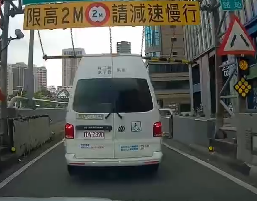 復康巴士撞到限高桿硬闖。翻攝畫面