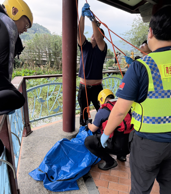 14時48分先行到達現場隊員李宗翰確認患者為浮屍疑似為女性,立即回報指揮官小隊長孫耀亭,由於環湖步道狹小11車無法進入道路,隨即由救災後勤車載送掛梯、繩索救援器材及攜帶水域裝備趕往現場。小隊長孫耀亭、施凱翔著水域裝備並指揮隊員李宗翰、林彥至、蔡旻翰及向匡尹利用器材於上方架設省力系統,由小隊長孫耀亭利用掛梯接近大體接著將大體裝入袋中,後由上方同仁利用繩索拖拉後將大體拖離水面案至於涼亭,初步查出死者是1名65歲高姓女子,後續轉交由警方調查處理。