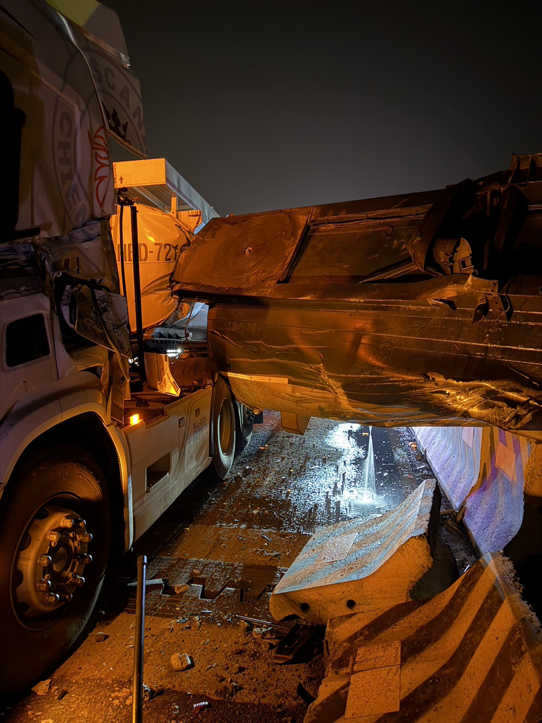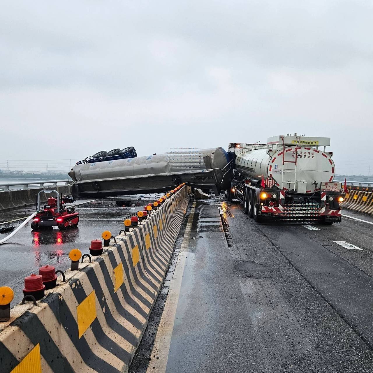 【Lai傳媒、記者爆料網/周庭慶/彰化報導】台61線北上161K中彰大橋路段今(17)日凌晨發生重大事故!1輛北上槽車撞擊小貨車及中央紐澤西護欄,護欄倒在南下車道又造成3輛車撞擊,造成1輛槽車翻覆裝載的醋酸甲酯外滲路面,現場共有3名傷者由台中市、彰化縣消防局送醫,目前現場仍封閉管制中。