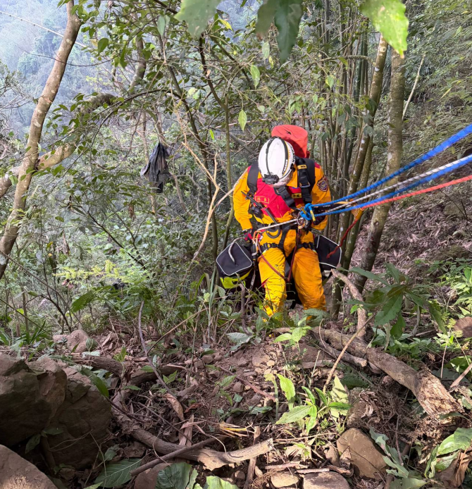 南投縣消防局昨日11時56分獲報,立即派遣竹山分隊前往搶救,並同步聯絡雲林縣消防局派員支援,救援人員架設繩索系統進行垂降搜索,13時22分搜救人員接觸車輛殘骸,但經初步搜索,車體內及周圍均未發現傷患,為確保搜索零死角,現場同步運用空拍機執行廣域空勘,並增派南投分隊趕赴現場支援。