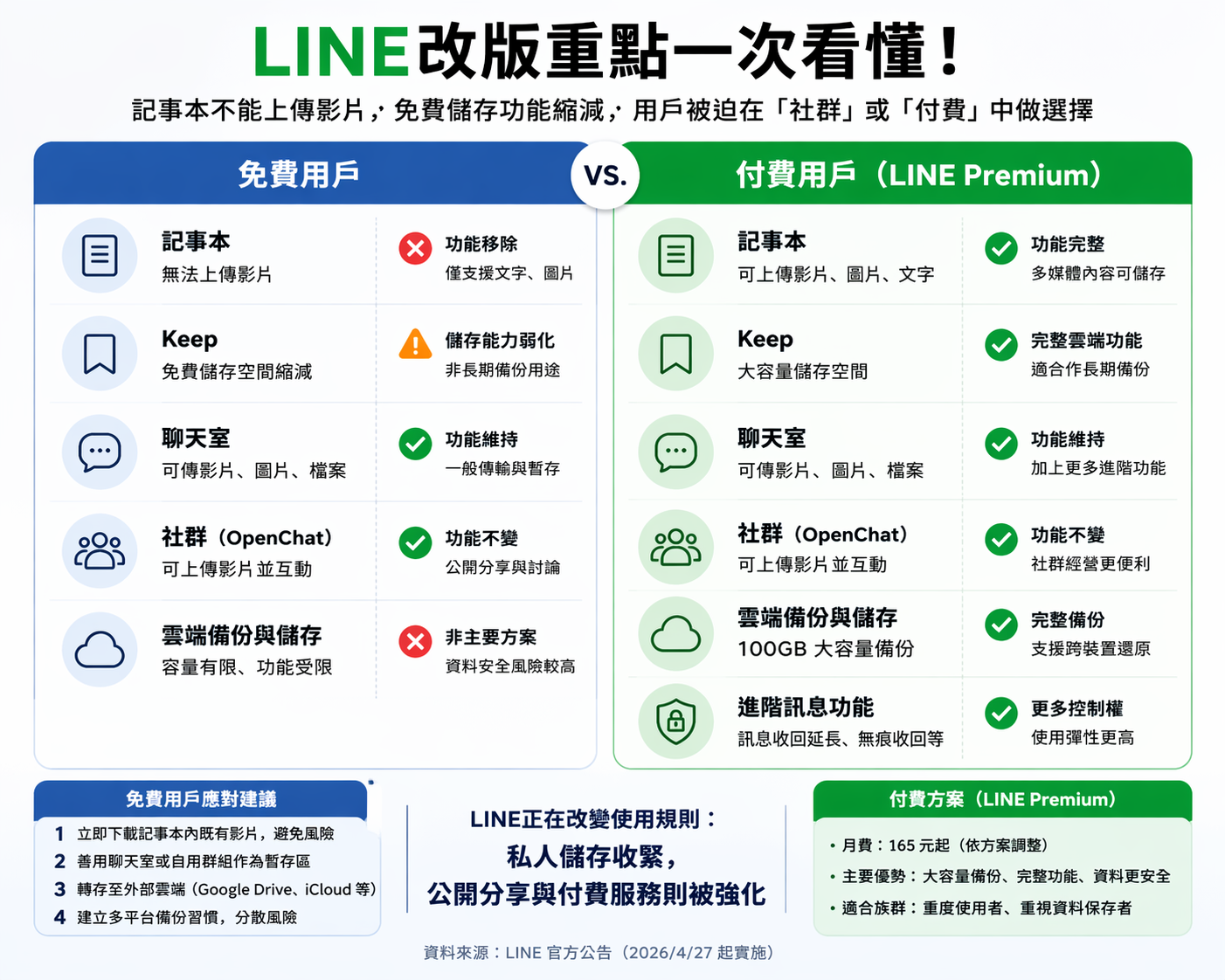 整體而言,本次調整並非單純功能刪減,而是平台對資料儲存架構的重新分配。未來LINE在免費與付費服務之間的界線將更為明確,使用者也需重新建立跨平台的資料管理習慣,以因應持續變動的數位使用環境