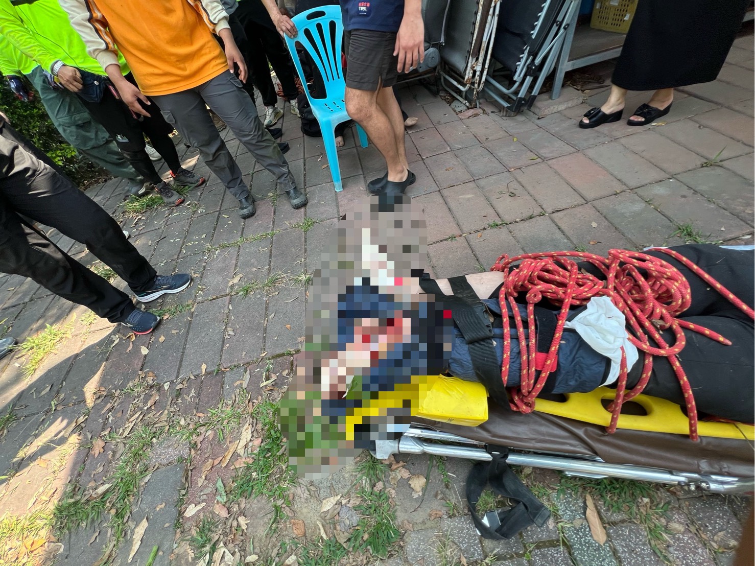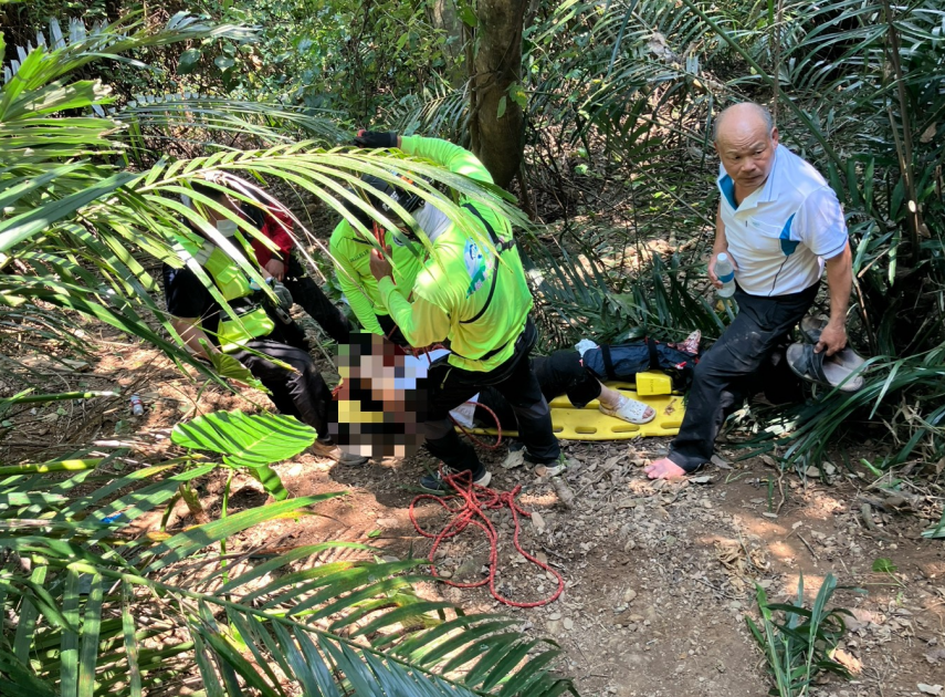 該名婦人左腳開放性骨折、意識清楚,消防隊員以長背板人力搬運方式將傷者搬運至救護車包紮處置,14時5分送往台東馬偕醫院。