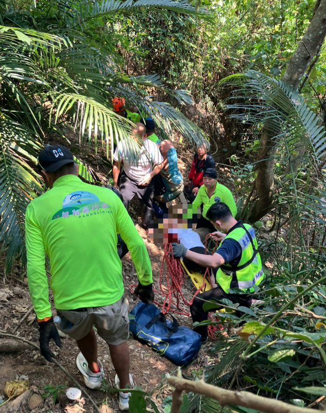 台東鹿野鄉發生飛行傘起飛失敗,一名婦人摔落邊坡左腳骨折意外,消防隊員前往救護。翻攝畫面