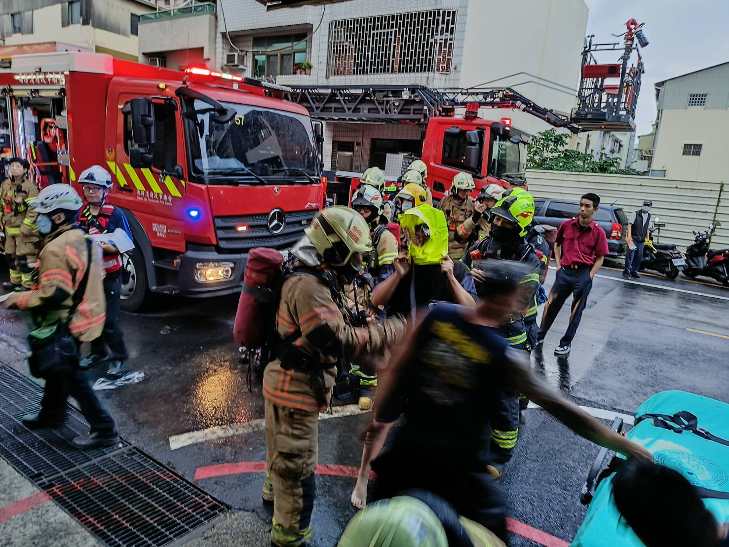 119勤務中心獲報後,立即派遣附近分隊共28車79人到場搶救,消防人員抵達後已有明顯火煙,立即布水線灌救,火勢於5點49分獲得控制,5點57分完全撲滅,進行殘火處理。第一時間透過消防中心電話聯繫受困民眾,指引他們就地避難、緊閉房門,爭取救援時間。