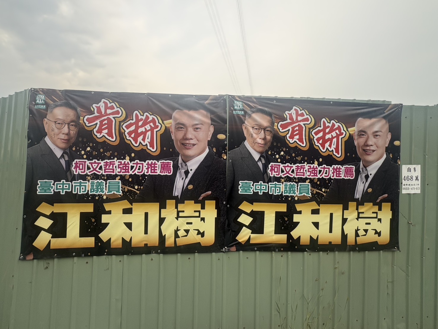 【Lai傳媒、記者爆料網/周庭慶/台中報導】爭取連任的民眾黨台中市議員江和樹,最近推出有他與前民眾黨主席柯文哲圖像的競選布條,發現柯文哲的臉被黑色簽字筆寫上「死」、「圖利」、「貪污」,立即報警偵辦。