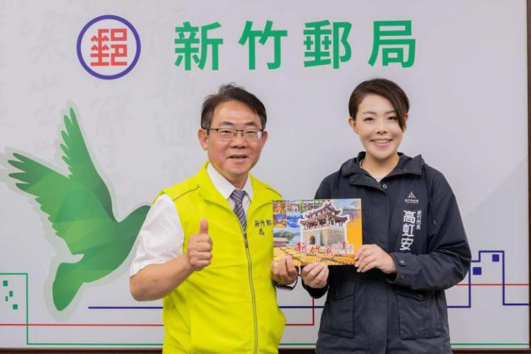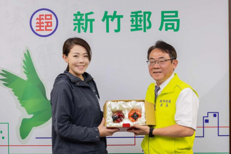 ▲新竹郵局局長沈佛龍致贈禮品予市長高虹安。(圖/記者蔣彤雲攝)