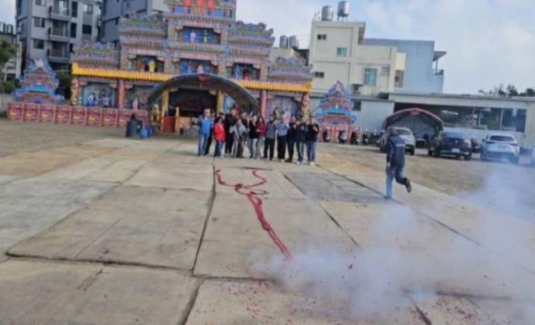 ▲高市長支持者徒步至七伍王爺醮壇興奮的燃放。(圖/記者蔣彤雲攝)