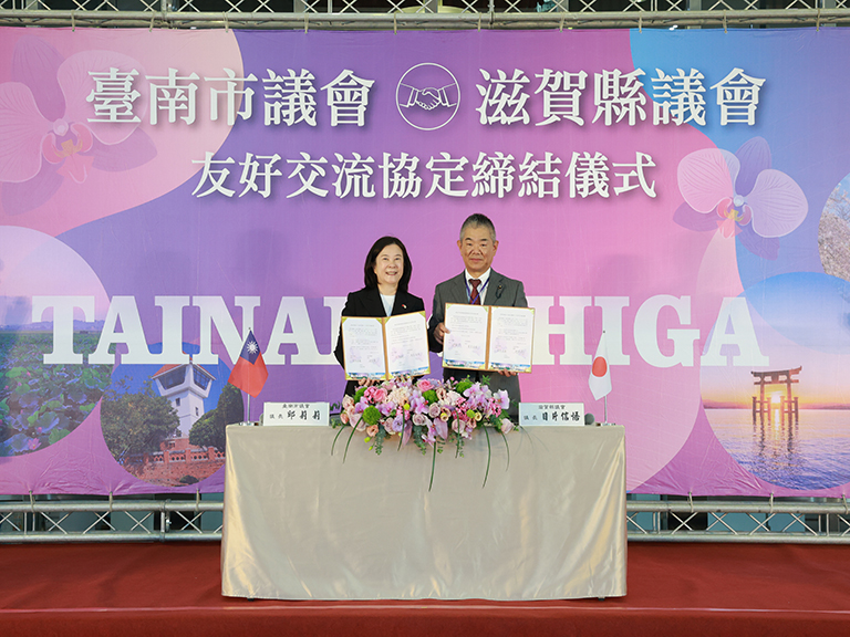 臺南與滋賀自2013年簽署經濟交流備忘錄以來,雙方互動頻繁、成果豐碩。臺南市議會與日本滋賀縣議會於4月10日正式簽署友好交流協定,象徵兩地在長期友好基礎上,邁入更緊密的合作新階段。簽署儀式由臺南市議會議長邱莉莉與滋賀縣議會議長目片信悟共同完成,現場氣氛隆重而溫馨。