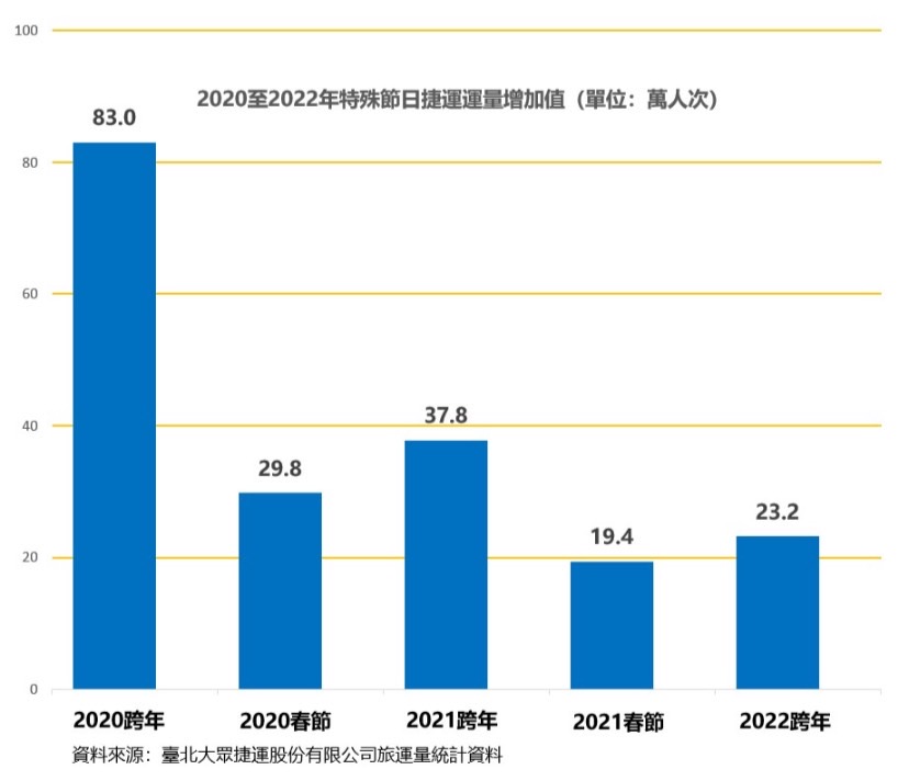 據統計,跨年活動或特殊節日連假時旅運量均大幅上升,如2021年跨年晚會,運量較平日增加37.8萬人次、2022跨年晚會則增加19.4萬人次,2021春節連假前夕運量亦增加23.2萬人次。時逢歲末年終,2022年農曆春節連假、燈節活動將至,捷運警察隊呼籲,隨人潮湧入捷運系統,因站內外氣溫差異大,而導致舊疾復發之例子屢見不鮮,有相關病史的民眾應避免獨自搭乘捷運,以策安全,若感身體不適可向站務人員求助,緊急狀況亦可按壓車廂、月臺之緊急對講機求援;遇有他人需救護狀況,可協助解開病患身上約束衣物,檢視呼吸狀況,並保持病患側躺以利呼吸暢通,等候專業醫護救援。
