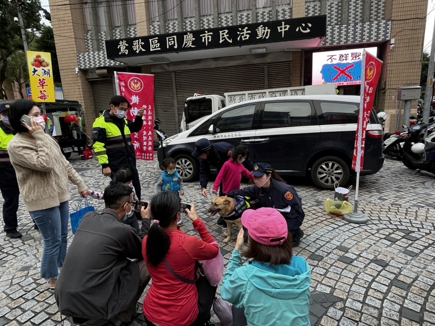 春節前的周末好天氣,警犬「平安」由亮麗女警帶隊,準時出勤,吸引粉絲好奇圍觀,要求排隊合照,小朋友看到警犬「平安」穿著帥氣的制服出勤,臉上更是難掩喜悅,但卻不敢輕易接近,現場女警即時展現親和力,拉著小朋友的小手與「平安」互動合照,並即時遞送犯罪預防宣導品,現場民眾直呼幸運,警犬「平安」人氣滿滿。