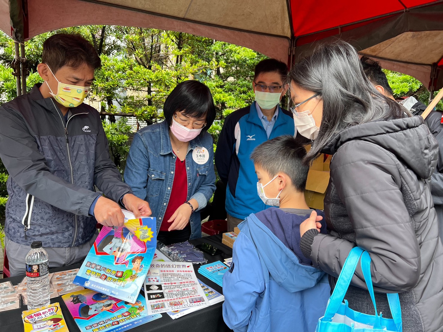 海山分局員警,配戴警察大頭娃娃前往設攤宣導,除了文宣之外,另精心準備多强吸水毛巾、多功能掛勾、多功能文具、伊莎貝兒手工皂、多功能砧板、飲料等豐富多元宣導品,藉由有奬徵答,介紹新興毒品種類、如何防範毒品、假冒親友猜猜我是誰、假冒公務機關以及假綁架等常見詐騙手法,引導提醒參與的大朋友小朋友如何自我保護、模擬演練反毒防詐情境及傳遞因應作法,有奬徵答認真聆聽熱情互動之朋友,提醒注意預防走失、自我保護、各類詐騙手法及因應判讀,多元體驗及活潑互動,大手牽小手耐心聆聽、反應熱烈。