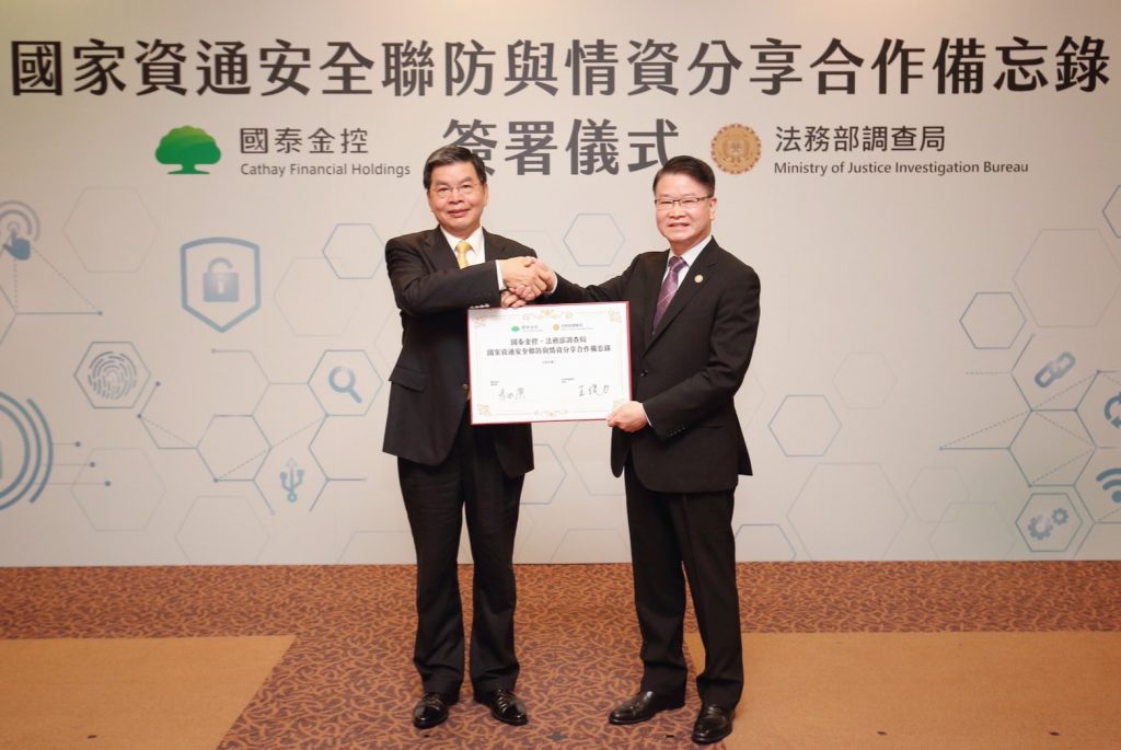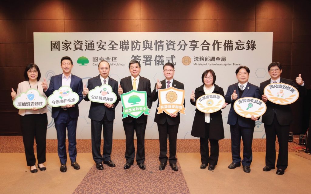 法務部調查局與國泰金融控股股份有限公司(下稱國泰金控公司)於今(14)日假國泰世華銀行總行國泰金融會議中心(B、C廳)簽署「國家資通安全聯防與情資分享合作備忘錄(MOU)」,簽署儀式由國泰金融控股股份有限公司李長庚總經理主持,調查局王俊力局長代表調查局與國泰金控公司簽署合作備忘錄,資安長吳富梅主任秘書、臺北市調查處孫承一處長、資通安全處余尚賢處長、洗錢防制處藍家瑞處長及經濟犯罪防制處高聰明處長暨同仁共同觀禮,場面隆重。